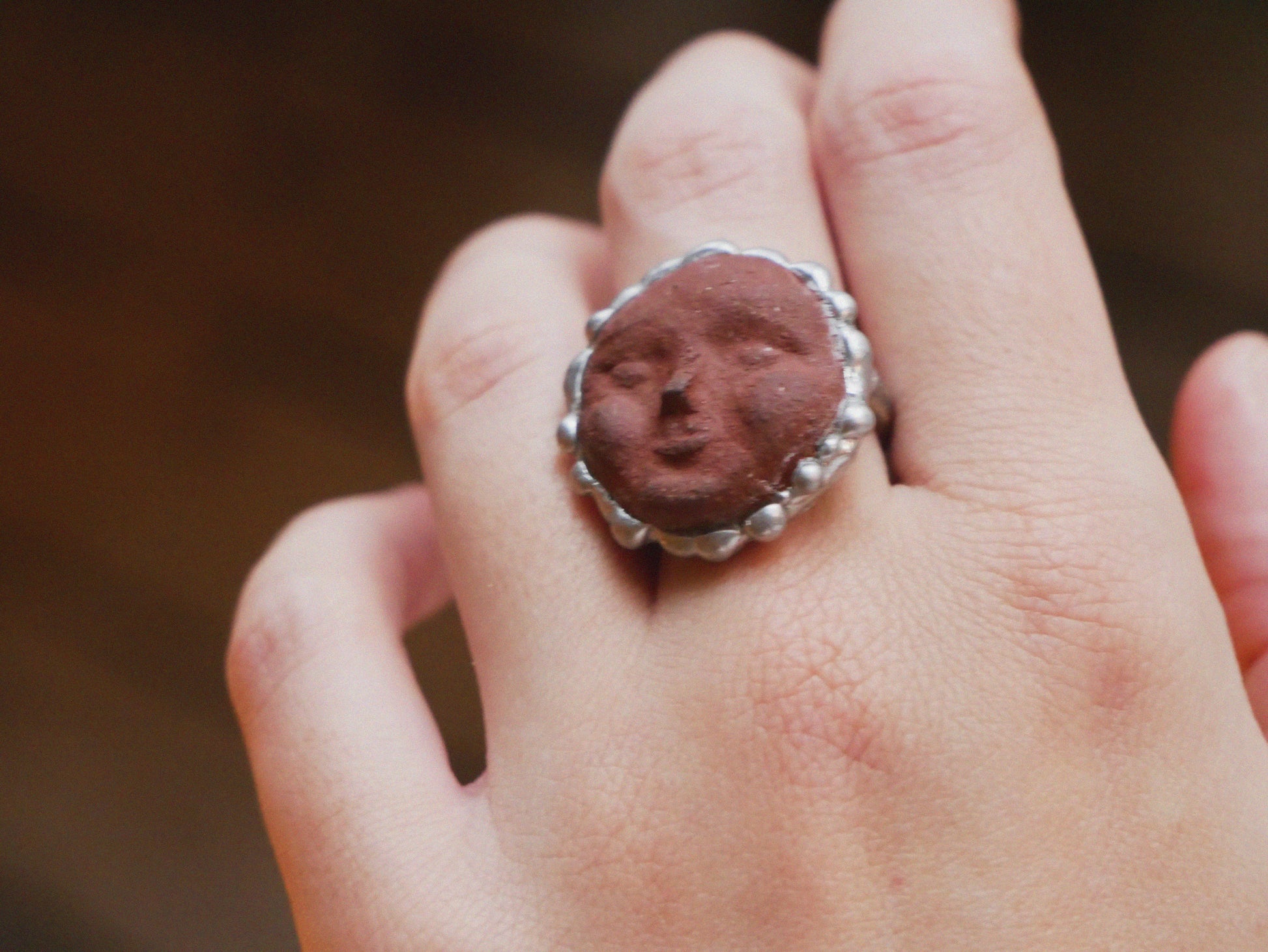 Foraged Clay Moon Face Ring With Sterling Silver Band Size L