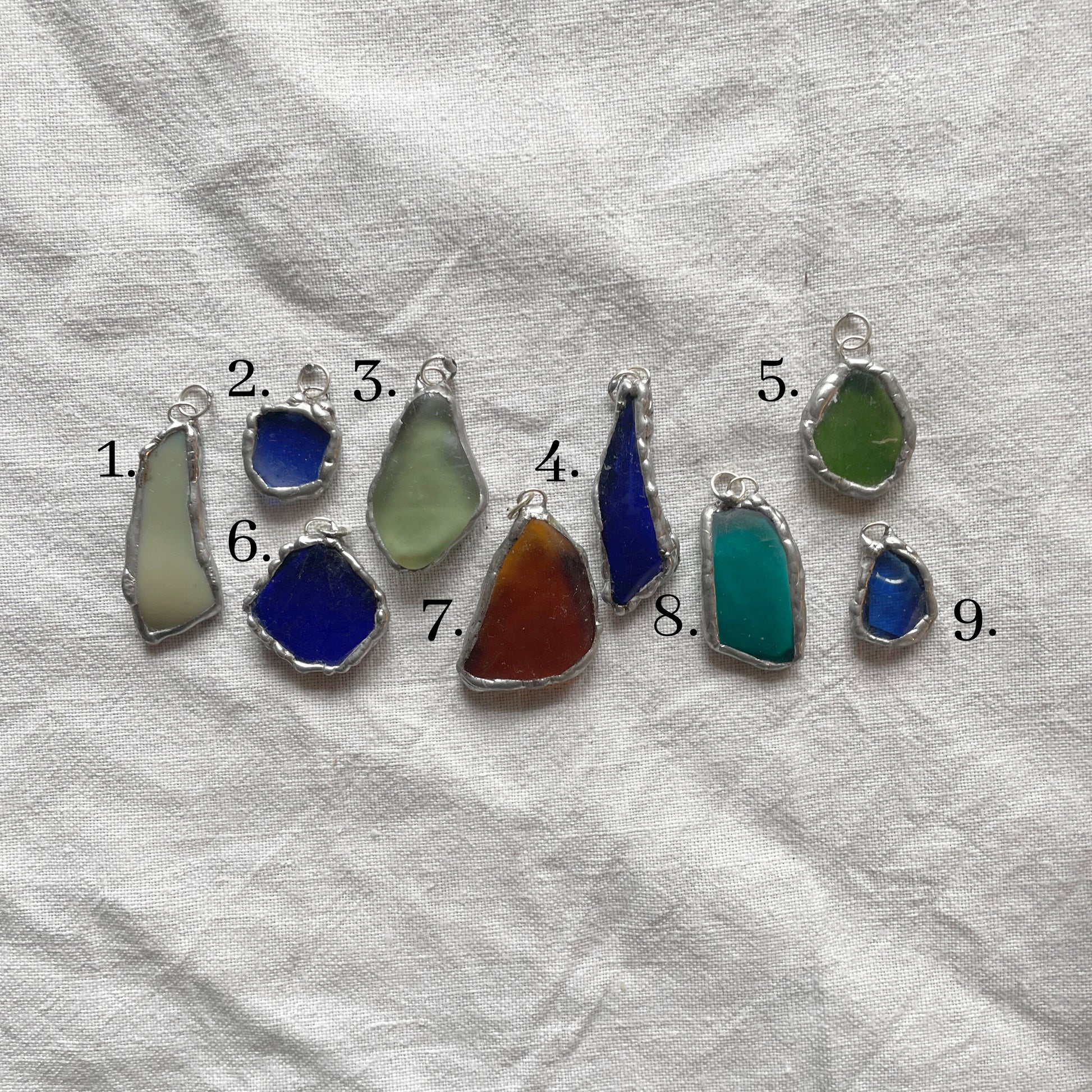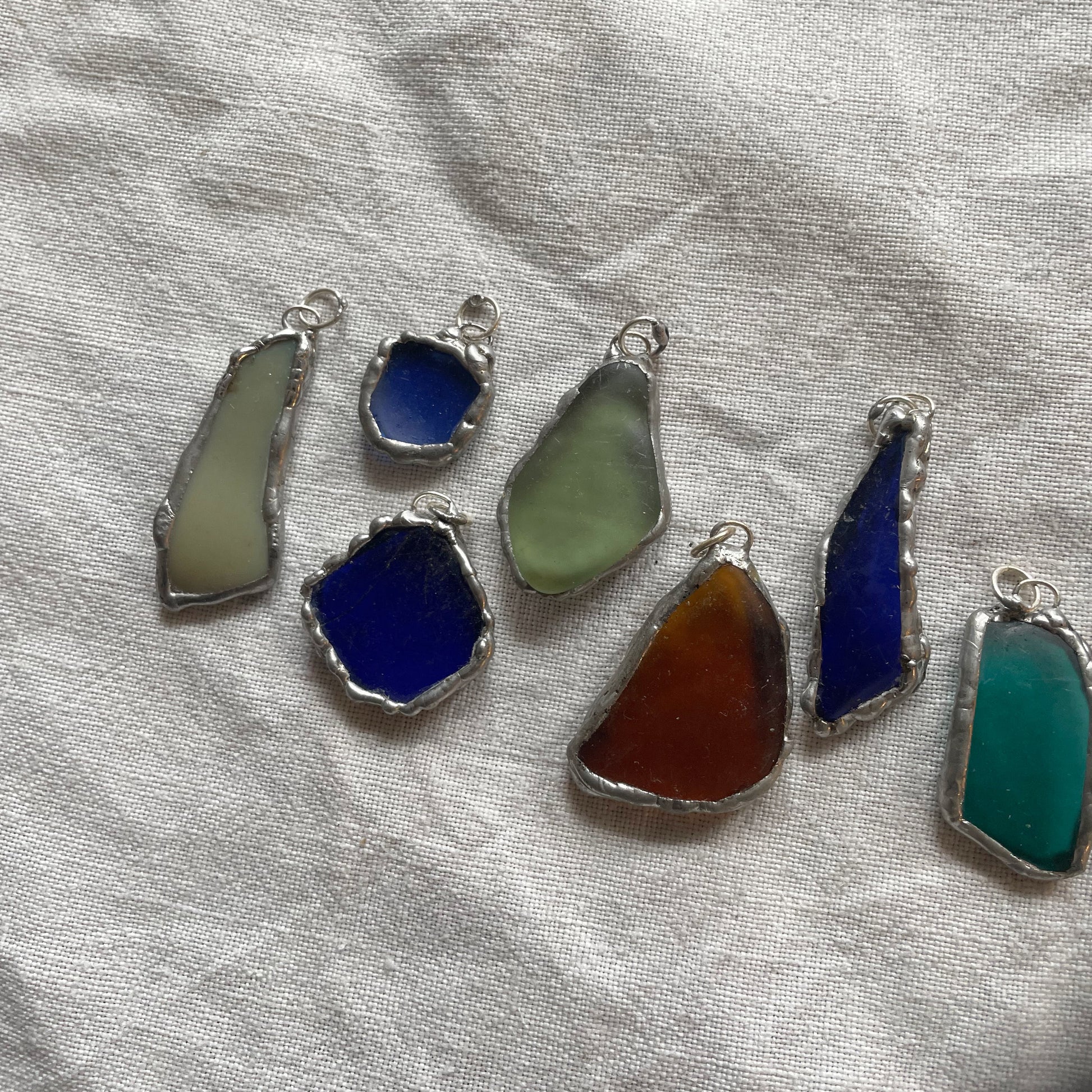A piece of sea glass found on a south coast beach, encased in silver mix solder and a sterling silver jump ring.