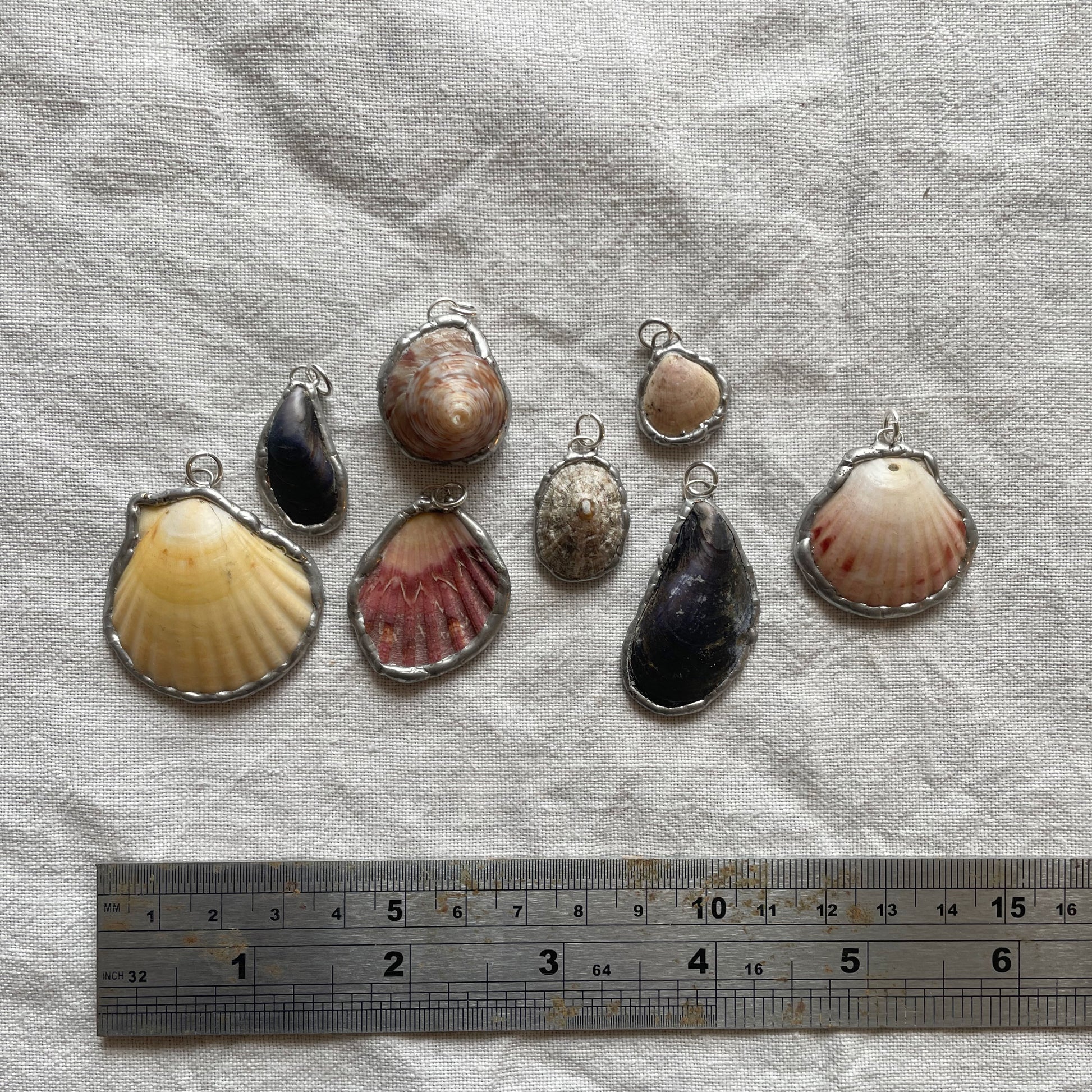 A shell found on a south coast beach, encased in silver mix solder and a sterling silver jump ring.